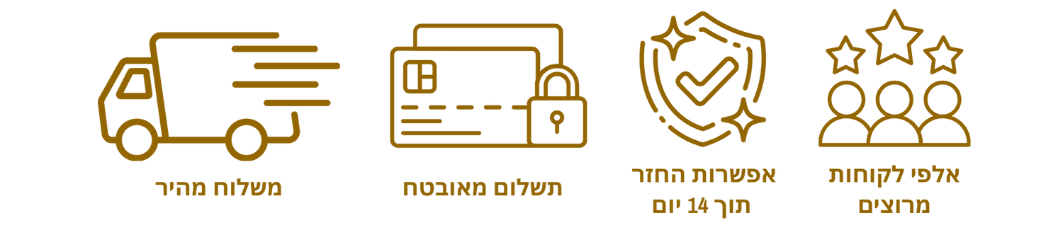 זמני המשלוח הסטנדרטיים הם 7-14 ימי עסקים, בעקבות הביקוש הרב והמצב הביטחוני ייתכנו עיכובים וזמני המשלוח עלולים להתעכב בכמה ימים, אנא האזרו בסבלנות.